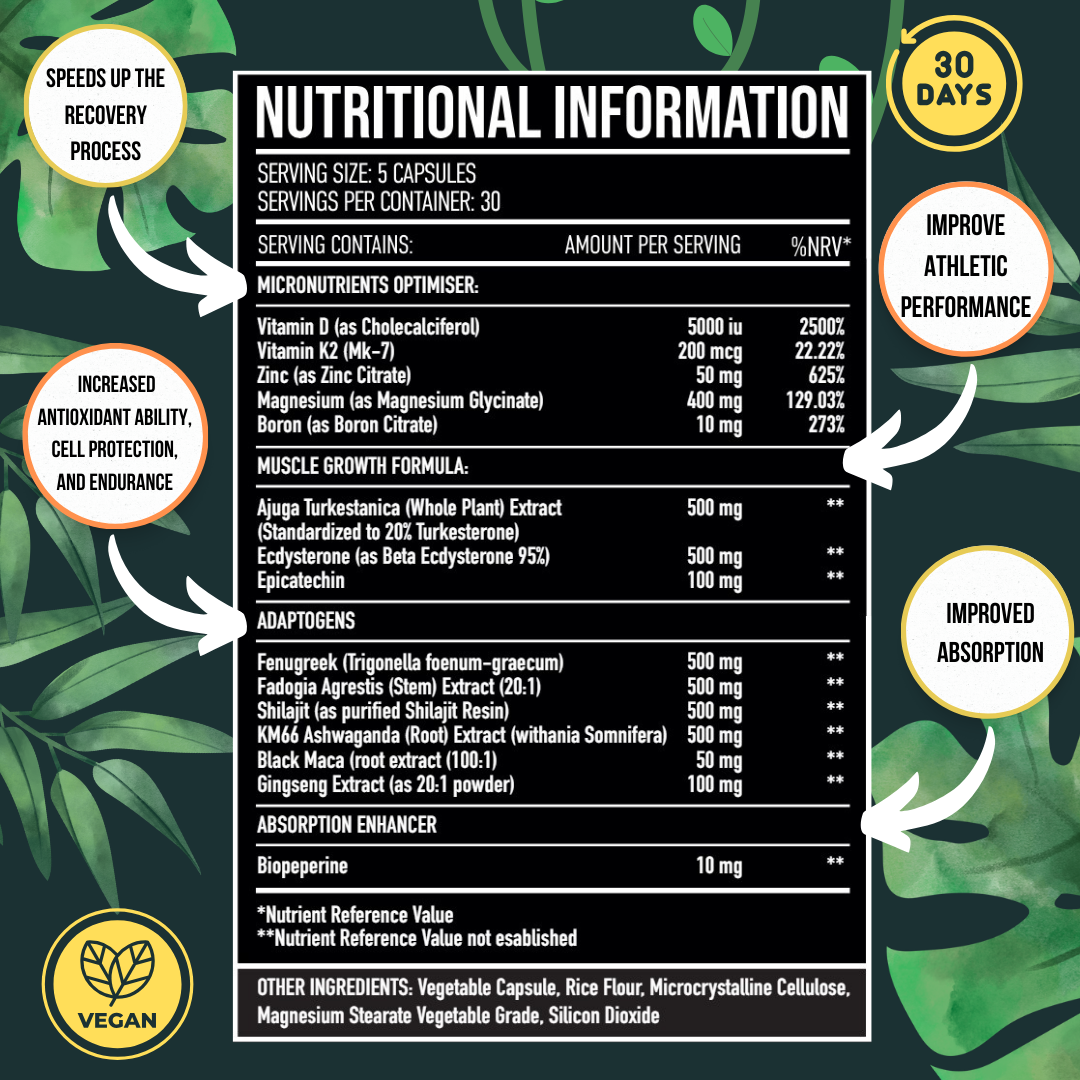 Enhanced Muscle Growth: With ingredients like Ajuga Turkestanica, Ecdysterone, and Epicatechin, the formula supports muscle development and recovery.